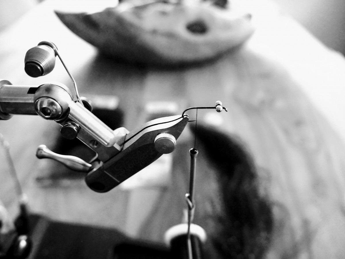 1) Fix the eyes with the thread by wrapping in figure of 8 turns just behind the eye of the hook. Make sure you leave a small gap;